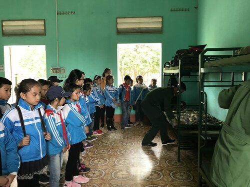 Một số hình ảnh các em học sinh thăm nơi ở của các chú bộ đội và thực hành gấp chăn màn cùng các chú: