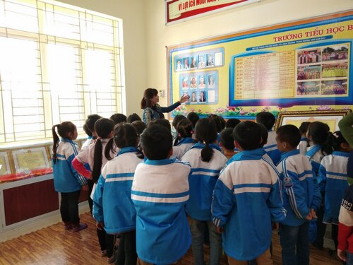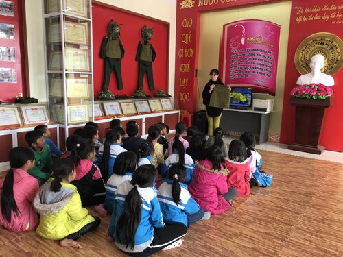 Các em học sinh tham quan phòng truyền thống của nhà trường